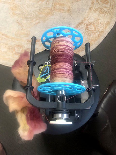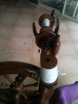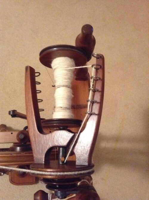 To keep the wheel spinning, progress is happening on the yarn for the alpaca/wool cushion. Already have two bobbins spun and onto the third. Going well. More to come…