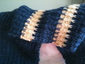 This one I created for Mum – I balanced the blue with a lovely peachy shade, and drop-stitch pattern making the texture quite thick and warm, even though the yarn was only about a four ply thickness.