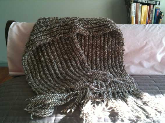 Dad’s scarf I knitted in Fisherman’s Rib, again giving a good thick texture and light in weight