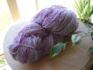 Handspun by me, in uneven spinning, to give a textured look when knitted or crochet. You can also use it for weaving. Soft enough to wear next to the skin.